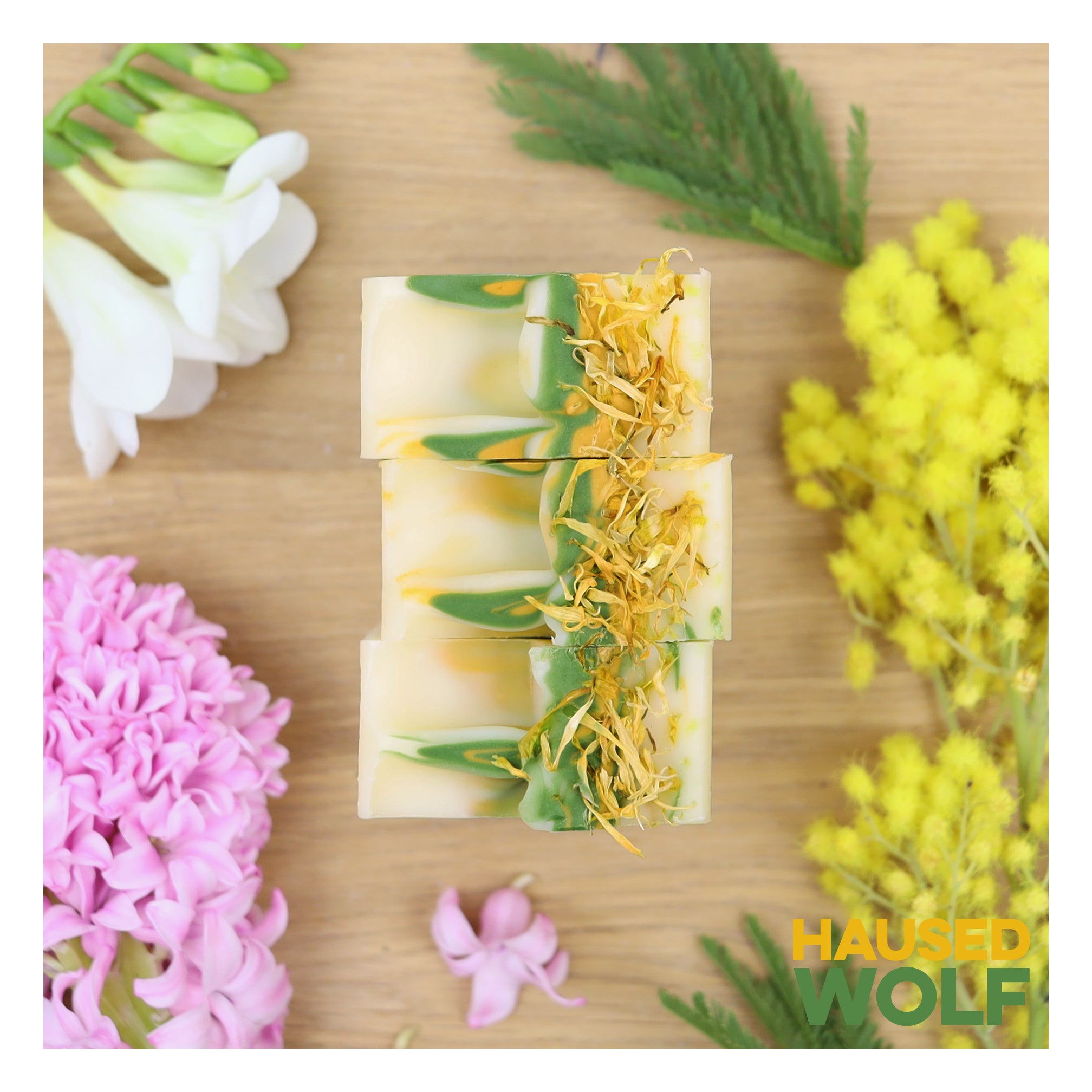 • Unsere bewährte Naturseifenbasis aus sechs hautverwöhnenden Pflanzenölen und -buttern, wie